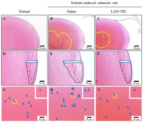 Lens structure of sodium-selenite-induced cataractic rats repeatedly co-instilled with LAN-ONSs and NIL-ONSs. (A–C): total lens. Yellow area represents the perinuclear refractile ring. (D–F): equatorial bow region of the lens. Black dotted line and blue arrowhead denote the delay of morphological differentiation. (G–I): lens fiber area on anterior capsule side. Blue arrowhead denote swollen fibers. Twenty microliters of ophthalmic formulations (0.5% LAN or 0.6% NIL), shown in Table 1, were instilled one time/day for 28 days. The start day and the end day of dosing were 7 and 35 days, respectively. The lens structure was measured at 35 days after the injection of sodium selenite. Scale bar, 50 μm. Normal, lens structure in normal rats. Saline, lens structure in sodium-selenite-induced cataractic rat repeatedly instilled with saline. LAN + NIL, lens structure in sodium-selenite-induced cataractic rat repeatedly co-instilled with LAN-ONSs and NIL-ONSs. The sclerotic lens nucleus (perinuclear refractile ring), the delay of morphological differentiation, and increased number of swollen fibers in sodium-selenite-induced cataractic rats were attenuated by the co-instillation of LAN-ONSs and NIL-ONSs.