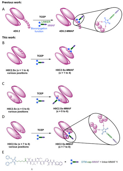 We developed eight original scFvs (new IDC strategy), where no flag peptide was needed, and two residues at key positions were mutated to cysteine in order to have a linear or conformational “C.C” bioconjugation motif. Our results showed no proteolysis issue and satisfying production yields in CHO cells for new scFvs H0C2.S1 to H0C2.S8. In addition, we managed to demonstrate that the reaction of linker-MMAF 1 was more or less difficult depending on the location and accessibility of the bioconjugation site onto the scFvs. Indeed, among the eight proposed scFvs, only four scFvs (H0C2.S3 to H0C.S6) displayed excellent bioconjugation ability, leading to the corresponding FDCs H0C2.Sx-MMAF (x = 3 to 6) with an average DAR close to 1.0.