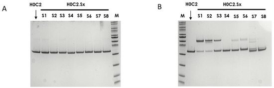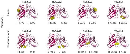 Thus, we developed here a second strategy, the intra-domain cysteine (IDC) strategy, where four solutions have been identified to reproduce this “CxC” linear motif (H0C2.S1 to S4). In parallel, the cysteines could also be a “C.C” conformational motif (H0C2.S5 to S8), where the cysteine residues are nearby in space, while distant in the amino acid sequence, according to the three-dimensional structure of the scFv conformation. The different cysteine positions clearly influenced the covalent oligomerization of the scFv fragments. The “linear” mutations were made in a comparable way on the VH and VL. However, the S1 or S2 positions on the VH, respectively, equivalent to S3 or S4 on the VL, led to a different result, in particular with a large majority of dimer for S1 and S2. For S7 and S8, the mutations were made symmetrically on the VH and VL resulting in the formation of an inter-domain disulfide bridge. This was checked on SDS-PAGE by the greater migration of S7 and S8 compared to the other fragments. When the SDS-PAGE analysis was performed under reductive conditions (