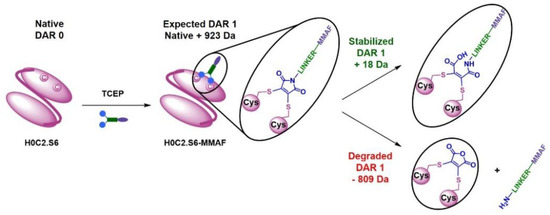 In the third category, the best bioconjugations were observed with H0C2.S3 to H0C2.S6, and following our results, it is possible to classify the conjugation sites from least to most favorable: S6 < S3 < S4 < S5. Although it was not the goal of this study, it is noteworthy to add that the average DAR was probably improvable by (i) a slightly better reduction for S4 and S3, to avoid the remnant native dimer, and (ii) by a number of linker equivalent being optimized to avoid a non-conjugating part of the native monomer. DAR 2 fragments were observed on all the conjugable fragments (H0C2.S3 to H0C2.S6). Concerning the stabilization of the conjugated linker by the close protein environment, on the one hand, we noted that only for H0C2.S6-MMAF of DAR 1, an increment of +18 Da was observed on the DAR 1. On the other hand, for the DAR 2, all the linkers were stabilized, and this was visible by an increment of 2 × 18 = 36 Da. Observing DAR 2 was not necessarily an issue, as it was always in minor proportion, and always observed with this bioconjugation technology in previous publications [