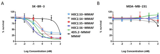 Cytotoxicity assay. SK-BR-3 and MDA-MB-231 cells were first plated at a density of 6 × 103 and 3 × 103 cells/mL in 96-well plates for 24 h and then treated with increasing concentrations of various preparations: H0C2.S3-MMAF, H0C2.S4-MMAF, H0C2.S5-MMAF, H0C2.S6-MMAF, 4D5.2-MMAF, MMAF.