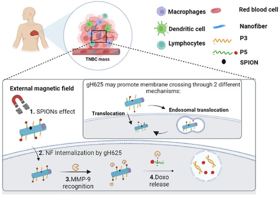 Schematic mechanism of action of the nanofibers. This Figure was created with BioRender.com (accessed on 28 December 2021).