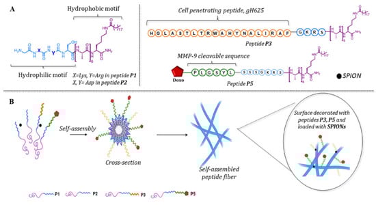 Schematic representation of peptides involved in nanofiber composition (A) and the potential self-assembly process leading to the organization in nanofibers (B). This figure was created with BioRender.com (accessed on 1 January 2022).