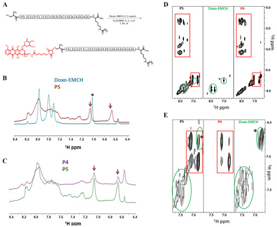 Synthetic strategy for achieving the conjugation of peptide P4 to Doxo (A). Comparison between 1D [1H] NMR spectra recorded in DMSO of Doxo-EMCH (light blue) and P5 (Red). The * and arrows are pointing to the double bond in the maleimide ring and the tyrosine aromatic protons in the P4 peptide, respectively (B). Comparison of 1D [1H] NMR spectra acquired in DMSO of P5 (green) and P4 (violet) peptides, signals from aromatic protons of tyrosine are indicated by arrows. Chemical shifts were referenced to the DMSO signal at 2.55 ppm (C). Comparison of 2D [1H, 1H] TOCSY spectra of P5 (left side, D), Doxo-EMCH (central, D) and P4 peptide (right side, D). The spectral region containing correlations including HN and aromatic protons are shown. The red rectangles highlight signals from the P4 peptide whereas, green cycles indicate peaks from Doxo-EMCH. The * points to a peak deriving from protons of the maleimide double bond (D). 2D [1H, 1H] TOCSY spectra recorded in D2O of P5 (left side, E), P4 (central, E), and Doxo-EMCH (right side, E). Red rectangles indicate peaks from aromatic protons in the tyrosine of the P4 peptide. Green cycles encompass peaks from Doxo-Maleimide. Chemical shifts were referenced with respect to residual water peak at 4.75 ppm (E).
