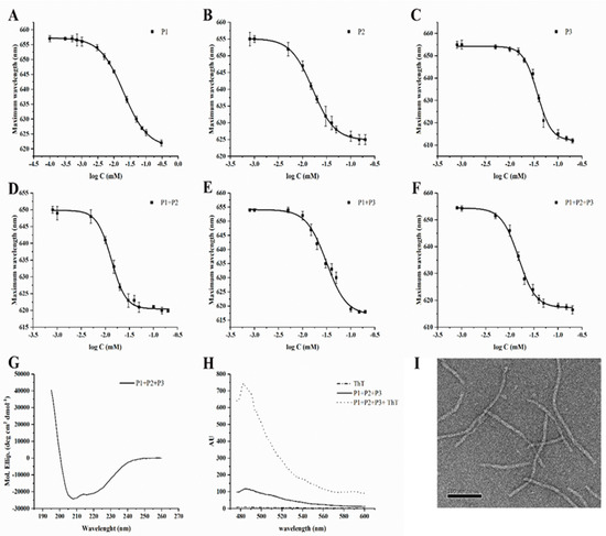 Fiber formation results: (A–F) report the critical aggregation concentration for P1, P2, and P3 alone, in their binary and ternary complexes; (G) reports the CD spectrum of P1 + P2 + P3 mixture; (H) reports the ThT fluorescence spectra increase in presence of aggregates of the P1 + P2 + P3 mixture; (I) shows the typical morphology of the P1 + P2 + P3 mixture as seen in TEM with negative contrast. Graphs were created with OriginPro 2021.