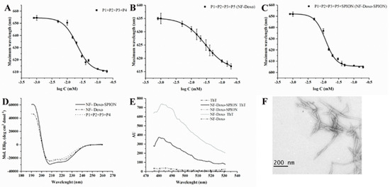 Fiber formation and characterization: CAC (A–C), CD results (D), Tht results, (E) TEM (F) for NF-Doxo, and NF-Doxo-SPION. Graphs were created with OriginPro 2021.