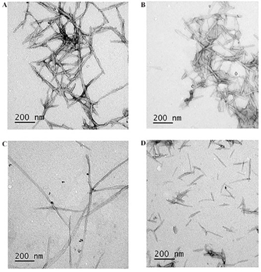 Morphological characterization was performed to analyze the self-assembled peptide nanostructures. Solutions of peptides and their mixtures were freshly prepared in ultrapure water at a concentration higher than their respective CACs. Then, three microliters of each sample were placed on the formvar carbon-coated grid for 1 h and washed with distilled water (three times 10 s). For negative contrast, the samples were incubated in a 2% water solution of uranyl acetate (3 × 10 s, 10 µL) and left to dry in a small drop of the last solution. The micrographs were obtained from JEM 1011 (Jeol Ltd., Tokyo, Japan) equipped with a Gatan digital camera driven by Digital Micrograph software (Gatan Inc., Pleasanton, CA, USA) at 100 kV.