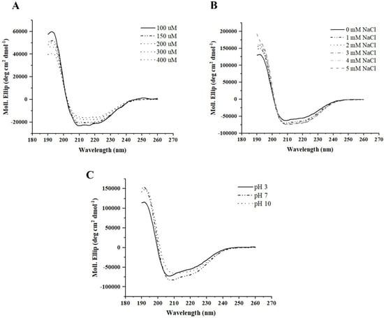 CD spectra of nanofibers NF-Doxo: effects of dilution (A), ionic strength (B), and pH (C). Graphs were created with OriginPro 2021.