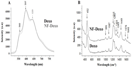 Fluorescence (A) and SERS (B) spectra of Doxo: free drug in aqueous solution compared with NF-Doxo in aqueous suspension.