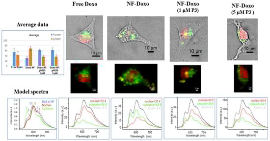 Results of fluorescence confocal spectral imaging on MDA-MB-231 cells treated for 1 h with 5 M solution of free Doxo in solution and with NF-Doxo, decorated with 1 or 5 µM of P3 or void of P3. Left top window: summarized statistical data on the two fractions of intracellular fluorescence: nuclear (red) and cytosolic (green). Top panels: typical spectral maps and their overlay with video images of the cells. Bottom panels: Window on the left side: model spectra of fluorescence–Doxo in NF-Doxo (blue); Doxo in nuclear zones (red); Doxo in cytosolic zones (green). Middle and right-side windows: average spectra of the cell shown above deconvoluted into the two model spectra (cytosolic and nuclear).
