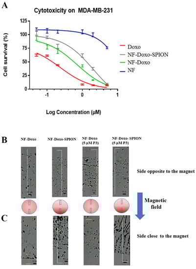 The cytotoxicity profiles of the NF-Doxo and NF-Doxo-SPION were established on cancer cell line MDA-MB-231 (triple negative human breast cancer). Triple MDA-MB-231 (ECACC, Salisbury, UK) cells were cultured at 37 °C in an atmosphere containing 5% CO2. The culture medium was made of DMEM supplemented with 10% fetal bovine serum, 1% non-essential amino acid (Hyclone Laboratories, Logan, UT, USA), and 1% penicillin/streptomycin (Gibco®, Life Technologies, Paisley, UK). The cell harvesting was made with trypsin/EDTA (0.05%) (Gibco®, Life Technologies, Paisley, UK) at 80% of confluence.