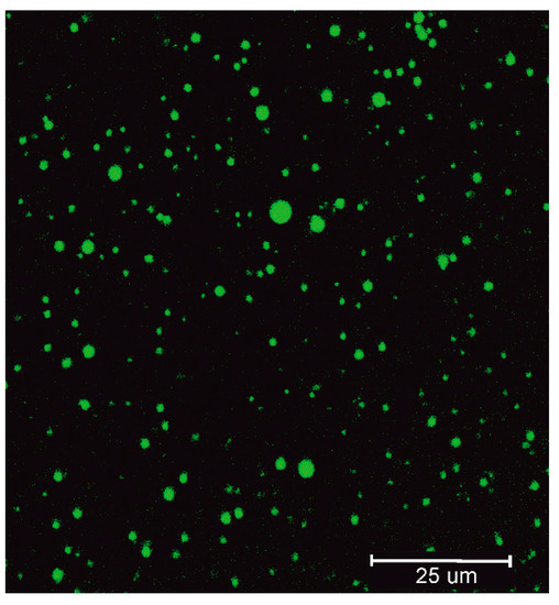 The first step was to evaluate the size of emulsion droplets. The thymol-containing SES was stained using a fluorescent dye, coumarin-6, and consequently visualized using confocal microscopy. This method allows direct particle size measurement in the water without any effect on the particle size, e.g., by additional dilution needed, drying of the sample, or any other procedure of sample manipulation. Figure 1 shows the visualized particles of the emulsion formed from SES after mixing with water. The particle size was determined between 1 and 7 µm using image analysis immediately after mixing SES with water. No significant difference in the size was observed after 1-h interval. The image analysis method of fluorescently stained particles was selected because of the presence of larger particles. Therefore, the sample was not suitable for measurement using dynamic light scattering. The particle size in a given size range corresponds to the intended purpose of promoting penetration into the intestinal wall, thus avoiding the systemic effect and lymphatic delivery typical of nano- and microemulsions [27].