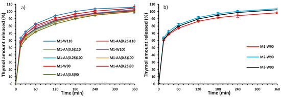 It can be noted that all dissolution profiles of the M1 samples showed common features. They exhibited a so-called burst effect, where an average of 60.6% of thymol was released during the first 15 min for the W-series, 57.0% for the AA(0.25)-series, and 54.5% for the AA(0.5)-series samples. When exposed to the AA solutions, the burst effect can be slightly reduced by chitosan gelling properties, lowering the API diffusion from pellets [30,42]. This observance was the most significant in sample M1-AA(0.5)90. Protonation of -NH2 groups in chitosan molecules leads to the formation of swelling cationic gel, which slightly retards thymol release from pellets [43]. In the 120th min, on average, all M1 samples released 87.5% of thymol; in the 360th min, they all released ≥ 100%. Although the differences between W-series and AA-series were found, according to f2 analysis, all dissolution profiles were considered similar (Figure 2a, Table 3) [44]. The similarity of dissolution profiles has also remained in the M1-W90 stability study. Similarity factor f2 varied in the interval between 91.62 at 25 °C, 60% RH, and 73.14 at 40 °C, 75% RH after four months compared to the time t = 0.