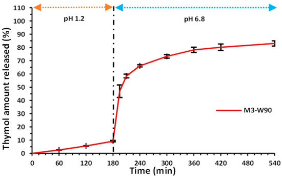 The C-M3-W90 pellets spray-coated by Eudragit® L30 D-55 dispersion were tested for in vitro dissolution behavior in conditions mimicking the GI fluid of the proposed rabbit animal model (Figure 3). The data showed 9.2% of thymol released in acidic conditions during the first 180 min. This satisfactory result can be correlated with the authority standard limiting the drug released in enteric-coated formulations to 10% in 120 min [52].