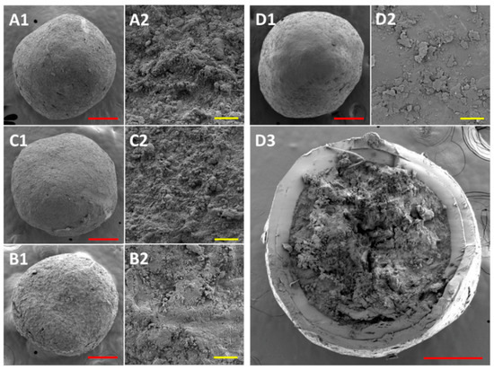 SEM images of selected samples: (A1,A2) sample M1-W90; (B1,B2) sample M2-W90; (C1,C2) sample M3-W90; (D1–D3) sample C-M3-W90. Note: 1 represents the whole pellet, 2 represents the detailed surface, and 3 represents the pellet cross-section. The red and yellow bar corresponds to a length of 200 µm and 10 µm, respectively.