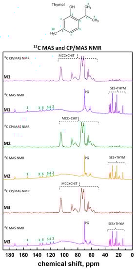 Molecular structure of thymol with atom numbering used in NMR spectra and the 13C CP/MAS and 13C MAS NMR spectra of the prepared pellet cores (M1, M2, and M3).