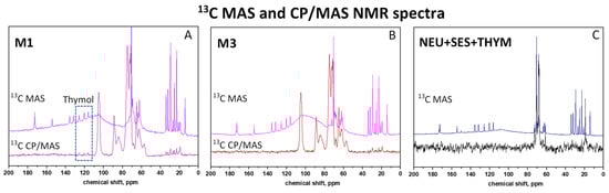 Detailed comparison of the 13C CP/MAS and 13C MAS NMR spectra of: (A) the pellet cores M1, (B) the pellet cores M3, (C) the model physical mixture Neusilin® + SES + thymol.