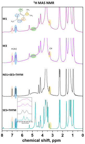 The 1H MAS NMR spectra of the pellet cores M1 and M3 and the model physical mixtures Neusilin® + SES + thymol and SES + thymol.