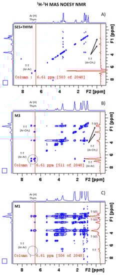 The 1H-1H MAS NMR correlation spectra recorded for: (A) the pellet cores M1, (B) the pellet cores M3, (C) the model physical mixture SES + thymol. The spectra were recorded with a spin-diffusion mixing of 250 ms.