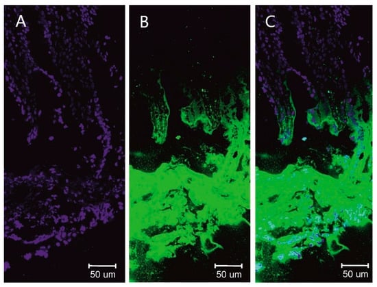 Cross-section of rabbit small intestine wall incubated with thymol/coumarin SES delivery system: (A)—nuclei stained using DAPI, (B)—fluorescent marker (coumarin), (C)—merge of (A,B).