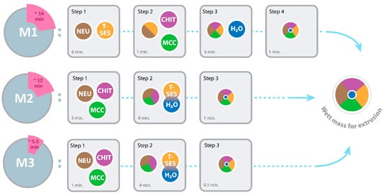 Graphical representation and timeline of the three different preparation procedures (M1, M2, and M3) of uncoated pellet samples. The duration of individual steps, as well as the duration of the whole process (cumulative time), are presented.