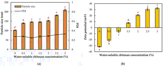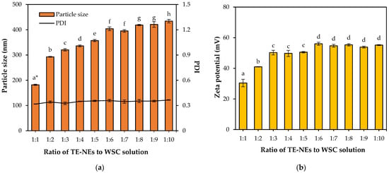 Effect of water-soluble chitosan (WSC) concentration on the physicochemical properties of the WCS-TE-NEs. Each WSC solution was mixed to TE-NE solution in ratio of 1:1 (w/w). (a) Particle size and PDI; (b) zeta potential of the WCS-TE-NEs. * Different letters indicate significant differences at p < 0.05 by Duncan’s multiple range test.