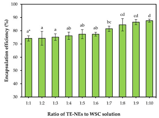 Effect of the TE-NEs/chitosan ratio on the encapsulation efficiency of the WCS-TE-NEs. * Different letters indicate significant differences at p < 0.05 by Duncan’s multiple range test.