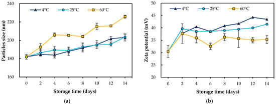 The stability of the WCS-TE-NEs was evaluated by measuring the changes in the particle size and zeta potential over storage time. The WCS-TE-NEs were stored at 4 °C, 25 °C, and 60 °C for up to 14 days, and their particle size and zeta potential were measured by DLS at 0, 2, 4, 6, 8, 10, 12, and 14 days (Figure 4). The particle size of the WCS-TE-NEs were significantly (p < 0.05) increased at all temperatures during storage. The bigger particle size of the WCS-TE-NEs at 14 days may be mainly ascribed to their swelling over storage time []. The particle size of the WCS-TE-NEs were steadily increased at 4 °C and 25 °C for 14 days, but the increase was much lower than that of 60 °C. The PDI of the WCS-TE-NEs was significantly (p < 0.05) decreased at 60 °C during storage. The zeta potential is considered to be an important parameter to assess emulsion stability as it governs the degree of repulsion between similarly charged dispersed droplets []. The zeta potentials of the WCS-TE-NEs were significantly (p < 0.05) increased from +30.4 mV to +43.5 mV at all temperatures. As expected, the WCS-TE-NEs were positively charged because of the positively charged amino groups of chitosan [].