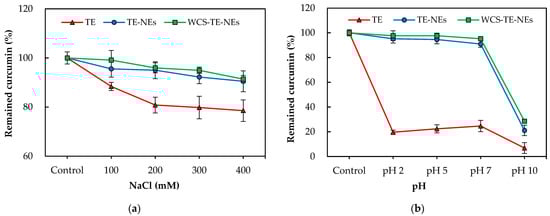 In order to discover the potential applications of nanoemulsions to foods, the influence of the NaCl levels and pH conditions on the curcumin content was measured. Nanoemulsions may be used in food and beverage products with different salt levels, and therefore, it is important to establish the impact of ionic strength on droplet stability. The stability of the emulsion plays an important role on the stability of curcumin, since the oil–water interface prevents the curcumin from being in direct contact with the oxygen and free radicals in the water []. The retention rate of curcumin in the presence of NaCl (0–400 mM) decreased from 100% to 78.5% upon the addition of NaCl to the TE. However, the concentration of curcumin decreased from 100% to 90.5% in the TE-NEs, and from 100% to 91.4% in the WCS-TE-NEs (Figure 5a). This result suggests that the combination of the repulsive interactions between the chitosan-covered droplets was strong enough to overcome the combination of attractive interactions. Li et al. [] also reported that the chitosan coating prevented nanoemulsion phase separation and improved storage stability by the ionic strength test.