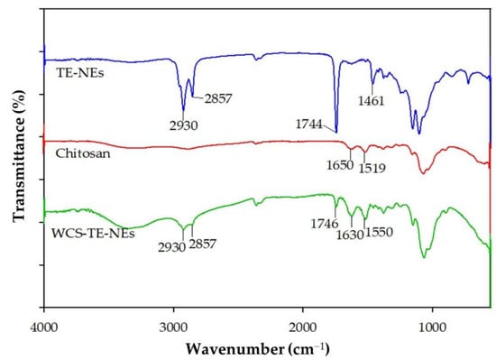 The interactions between the TE-NEs and water-soluble chitosan molecules were investigated by Fourier transform-infrared spectroscopy (FT-IR; NICOLECT iS5, Thermo Fisher Scientific, Madison, WI, USA). All IR spectra were measured at a 4 cm−1 resolution using a range of 4000–400 cm−1 and a scanning speed of 16 scans/min in transmission mode.