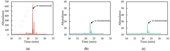 Gas chromatograms of ar-turmerone in TE (a), TE-NEs (b), and WCS-TE-NEs (c).