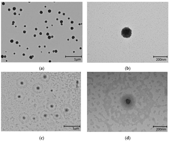 The surface morphologies of the TE-NEs and the WCS-TE-NEs were characterized by transmission electron microscopy (TEM). Figure 8 shows the TEM images of the TE-NEs and the WCS-TE-NEs particles at magnifications of ×7000 and ×30,000. The morphology of the TE-NEs and the WCS-TE-NEs was almost spherical, and the particle size ranged from 80 to 200 nm. An increase in the particle size through coalescence, flocculation, or aggregation was not observed in the TEM images of the TE-NEs and the WCS-TE-NEs. The WCS-TE-NEs had a bright contrasting band surrounding the droplets, as shown in Figure 8d. It can be seen that the coating layer looks hazy compared to the inner layer in which the particles are present. A higher atomic mass or density of inner layer appears darker because it absorbs more electron beams. The interaction of water-soluble chitosan with the surface of the TE-NEs was thus well visualized.