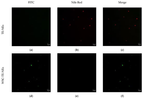 Confocal laser scanning microscopy images of TE-NEs (a–c) and WCS-TE-NEs (d–f). Nile Red dye shows a red color by binding with lipids and oils in the TE-NEs, whereas FITC shows a green color by binding with proteins and chitosan in the WCS-TE-NEs.