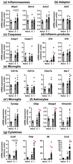 To further deepen the study of the inflammatory profile in WT animals, four pro-inflammatory cytokines were evaluated (Figure 1g). Kruskal–Wallis showed a significant effect of lesion in Ccl5 mRNA levels (p = 0.039) and Mann–Whitney revealed an increase in the ipsilateral side in comparison with naïve (p = 0.030) and a trend when compared to the contralateral side (p = 0.052). Tnfa, Il6, and Ccl2 showed very similar expression changes. Kruskal–Wallis showed a significant effect of lesion on Tnfa (p = 0.001), Il6 (p = 0.004), and Ccl2 (p = 0.003). Mann–Whitney tests revealed an increase in Tnfa in the contralateral (p = 0.010) and ipsilateral (p = 0.004) in comparison with naïve mice and a difference between the two sides of the injured brain (p = 0.010). Similarly, Il6 presented a significant increase in the ipsilateral side when compared with the naïve (p = 0.009) and the contralateral side (p = 0.008) and Ccl2 showed a very high increase in the contralateral (p = 0.028) and the ipsilateral side in comparison with naïve (p = 0.006) and a difference between the two brain sides of the injured animals (p = 0.016). Taken together, these findings indicate that Nlrp3 and Aim2 inflammasomes are overexpressed in the ipsilateral side of the lesion, resulting in the induction of Il1b, elevated microglia, and astrocyte reactivity markers and high expression of pro-inflammatory cytokines in both sides of the lesion.