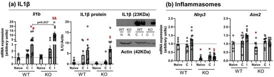 IL1β signaling in WT and NLRP3 KO mice 24 h after the lesion. (a) Changes in Il1β mRNA (left) and protein expression (center) in WT and KO mice. Naïve, contralateral, and ipsilateral sides were compared in both strains. Representative Western blot image of IL1β protein and actin is shown (right). (b) Changes in Nlrp3 and Aim2 mRNA levels in WT and KO. Naïve, contralateral, and ipsilateral sides were compared in both strains. Mean ± SEM (n = 6–11). Kruskal–Wallis or two-way ANOVA followed by Mann–Whitney or Bonferroni’s tests p ≤ 0.05. (* vs. WT Naïve; # vs. WT Contra; $ vs. KO Naïve; & vs. WT Ipsi (WT: wild type; KO: NLRP3 knockout; C: contralateral; I: ipsilateral).