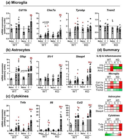 To further analyze the possible interaction between these two types of glial cells, the mRNA levels of different cytokines were also included (Figure 3c). All the measured cytokines showed an exaggerated response in the ipsilateral side of the KO mice. Tnfa data were analyzed by Kruskal–Wallis non-parametric test and showed a significant effect of the lesion in both strains (WT p = 0.008 and KO p = 0.000) and a significant effect of genotype in the ipsilateral side (p = 0.002). A subsequent Mann–Whitney test confirmed an increase in the contralateral (p = 0.020) and ipsilateral sides (p = 0.005) of WT mice in comparison with the naïve group of the same genotype; similar increases were found in the contralateral (p = 0.003) and ipsilateral (p = 0.000) sides of KO animals when compared with the naïve KO group. In NLRP3 KO, there was also a significant increase in Tnfa mRNA levels in the ipsilateral side compared to the contralateral side (p = 0.000) and an exaggerated response of the ipsilateral side of KO animals compared to their WT counterparts (p = 0.002). Il6 mRNA levels showed a significant effect of the lesion in WT (p = 0.019) that was higher in KO animals (p = 0.000). Furthermore, a significant effect of genotype was found in the ipsilateral side (p = 0.002). Mann–Whitney test revealed a significant increase in Il6 mRNA expression in the ipsilateral side of WT mice in comparison with the naïve group (p = 0.018) and with the contralateral side (p = 0.018). Within the KO group, there was a significant increment in the ipsilateral side compared to the naïve (p = 0.000), contralateral (p = 0.000), and the ipsilateral side of the WT group (p = 0.002). Following this same trend, Ccl2 mRNA expression showed a strong effect of lesion in the WT group (p = 0.002) and the KO mice (p = 0.000), together with a significant effect of genotype in naïve (p = 0.013), contralateral (p = 0.019), and ipsilateral (p = 0.009), demonstrating that this cytokine was a key molecule in the response after TBI and that, similarly to Tnfa and Il6, presented an exaggerated response in the ipsilateral side of the KO animals in comparison with the WT groups. These results corroborate the pro-inflammatory profile found in WT animals 24 h after TBI and show that NLRP3 KO mice respond in an exaggerated manner to brain damage, as reflected by the elevation in the microglial and astrocytic markers and the pro-inflammatory cytokines. A brief color-code summary is presented in Figure 3d.