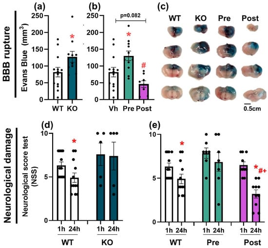 The presence and the activation time of the NLRP3 inflammasome is important for maintaining the integrity of the blood–brain barrier (BBB) and the severity of the neurological damage that occurs after a brain trauma. NLRP3 KO animals pre-treated with the selective inhibitor MCC950 showed an impaired BBB integrity and more neurological damage; these results were improved when MCC950 was given one hour after trauma. BBB rupture was assessed by the amount of the Evans Blue tracer that was extravasated (n = 8–13). The genetic approach to compare WT and NLRP3 KO BBB integrity (Figure 4a,c) showed a significant increase in BBB rupture in KO animals compared to WT (unpaired t-test, t = 2.104; df = 21; p = 0.0476). A pharmacological approach using a selective inhibitor of NLRP3 inflammasome (MCC950, 3 mg/kg) was also included (Figure 4b,c). One-way ANOVA showed a significant effect of treatment (pre, vh, post) (F(2, 29) = 8.341; p = 0.0014). A subsequent Bonferroni test confirmed a significant increase in the BBB rupture in animals pre-treated with MCC950 compared to vh animals (p = 0.0423), a trend to be decreased by the post-treatment (p = 0.082) and a significant difference between pre- and post-treated animals (p = 0.0012). These findings were supported by behavioral tests. The neurological score (NSS) test was performed at 1 h and 24 h after TBI to find differences between the strains (Figure 4d). Kruskal–Wallis showed a significant effect of time (1 h, 24 h) in WT animals (p = 0.034), whereas KO mice did not improve their neurological score at 24 h. Similar results were obtained when using the pharmacological approach (vh, pre, post), inhibiting the NLRP3 inflammasome 30 min prior to the TBI (pre) or 1 h after injury (post) (Figure 4e). Kruskal–Wallis revealed a significant effect of time (1 h, 24 h) in vehicle-treated mice (p = 0.034) and a bigger effect in the post-treated group (p = 0.001). A subsequent Mann–Whitney test showed a significant decrease in the neurological damage of post-treated animals compared to vehicle-treated (p = 0.038) and pre-treated mice (p = 0.006). Taken together, these findings highlight the importance of NLRP3 in maintaining BBB integrity and, thus, affecting neurological damage and the dual time-dependent role of this inflammasome to induce brain repair. In addition, the treatment with MCC950 1 h after TBI reduced the BBB rupture and the neurological damage, suggesting that this selective NLRP3 inhibitor could be a potential treatment for TBI patients if administered within the proper temporal window.