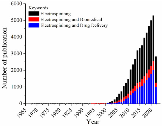 Considered a simple and versatile technique, electrospinning has emerged as a technology for developing 3D materials for a wide range of applications. Electrospun fibers ranging from nanometers to micrometers in diameter have been applied in many research areas including chemistry, materials science, engineering, and chemical engineering, as well as medicine, pharmacology, and pharmaceutics. Based on a large variety of polymers (natural or synthetic ones), types of collectors, and nozzle configurations, a vast and complex number of electrospun materials can be obtained, allowing those electrospun fibers to be applied for catalysis [1], separation and purification [2,3], chemical sensing [4,5], food packaging [6], tissue engineering [7], wound dressing [8], and drug delivery [9], among others. The ability to produce nanofibers with different biocompatible and biodegradable polymers, with low cost, unique physicochemical properties, small diameter, high volume to surface area ratio, has raised interest in the technique for the production of materials applied in drug biomedical applications. These uses can be highlighted as the most prominent ones, and these reviews can provide perspective on the fundamentals of electrospinning for biomedical applications [10,11,12,13,14], among other ones. Figure 1 depicts the number of publications per year, using three sets of keywords (searched within article title, abstract, keywords) using Scopus database: (i) electrospinning, (ii) electrospinning and biomedical, and (iii) electrospinning and drug delivery.