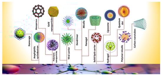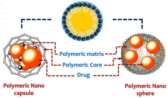 Polymeric nanoparticles are colloidal and stable nanostructures constructed of natural or synthetic polymers [87]. This might be of the storage variety (nanocapsules), which dissolve/disperse bioactive molecules inside the polymer core, or of the substance variety (nanospheres), which entraps bioactive molecules within the polymer matrix (Figure 1). In this context, polymeric nanoparticles can be applied as drug vehicles for cancer treatment [88]. The main types of polymeric nanocarriers are illustrated in Figure 2.
