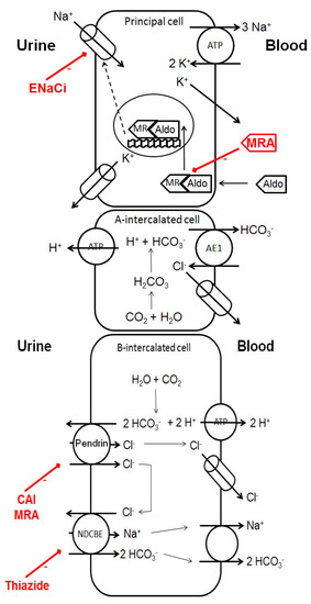 MRA are characterized by a slower onset of natriuresis, when compared to other diuretics. MRA act on basolateral side of aldosterone-sensitive cells of the collecting duct, and compete with aldosterone on its cytosolic receptor, thereby preventing its nuclear translocation. MRA thus lead to the proteasome-mediated degradation of ENaC (Figure 3). In principal cells, aldosterone stabilizes apical ENaC. Angiotensin II may restore aldosterone’s activity on the mineralocorticoid receptors of intercalated cells with the activation of pendrin-mediated sodium reabsorption in the case of volume depletion [49]. Other aldosterone effects include increased vascular tone and remodeling, increased response to catecholamine, and baroreflex modulation.