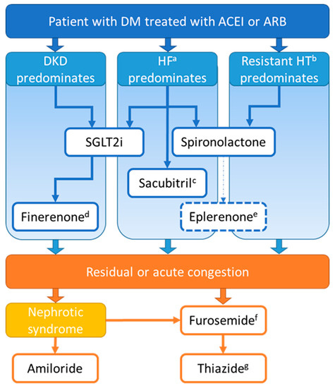 Suggested evidence-based approach for diuretic combinations in patients with diabetes mellitus treated with an angiotensin converting enzyme inhibitor or an angiotensin receptor blocker. a: especially with reduced ejection fraction. b: above-goal elevated blood pressure despite concurrent use of three antihypertensive drug classes (consider secondary hypertension assessment). c: discontinue ACEI or ARB before starting sacubitril/valsartan. d: if persistent proteinuria despite SGLT2i, consider adding finerenone. e: if endocrine adverse drug reactions are an issue, consider switching from spironolactone to eplerenone. f: for other loop diuretics; consider down-titrating to minimal effective dose after the emergency phase. g: e.g., hydrochlorothiazide or indapamide. DM: diabetes mellitus, ACEI: angiotensin converting enzyme inhibitor, ARB: angiotensin receptor blocker, DKD: diabetic kidney disease, HF: heart failure, HTA: hypertension.