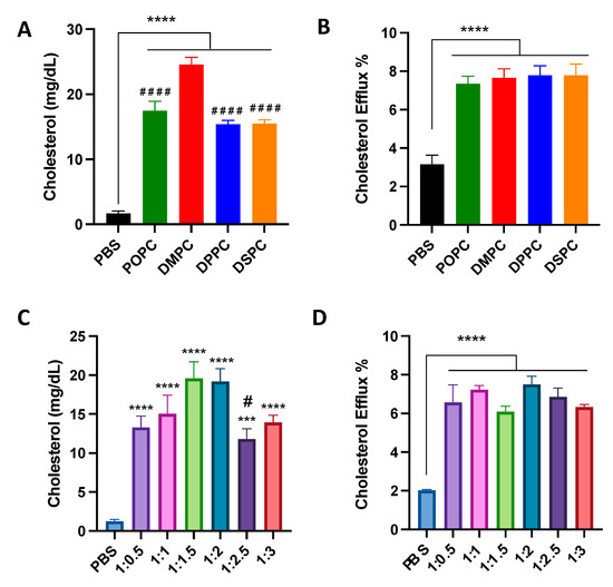 Figure 2. Cholesterol crystal dissolution after 7 days of incubation with different PC lipids (A) and different ratios of DMPC:DSPE-PEG2k (C). Effect of 4 h incubation of different PC lipids (B) and different ratios of DMPC:DSPE-PEG2k (D) on the cholesterol efflux of J774A.1 macrophage cells containing radiolabeled cholesterol. *** p < 0.001, **** p < 0.0001 when compared to untreated PBS group. (n = 3, mean ± SD. # p < 0.05, #### p < 0.0001 when compared to DMPC or 1:2 group).