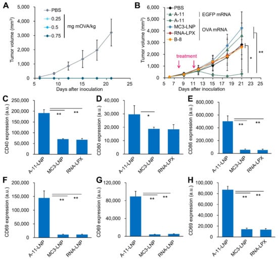 - Miao, L.; Li, L.; Huang, Y.; Delcassian, D.; Chahal, J.; Han, J.; Shi, Y.; Sadtler, K.; Gao, W.; Lin, J.; et al. Delivery of mRNA vaccines with heterocyclic lipids increases anti-tumor efficacy by STING-mediated immune cell activation. Nat. Biotechnol. 2019, 37, 1174–1185. [Google Scholar] [CrossRef]