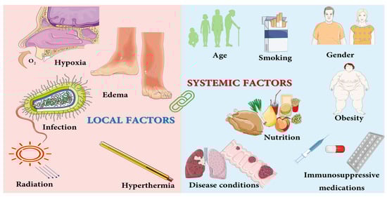 The wound healing process is dependent on several interlinked factors, which are mainly of two types: local and systemic factors (Figure 1) [14,15]. Local factors directly impact the wound characteristics, while systemic factors depend on the individual’s overall status of health or illness. Soreness, sepsis, irradiation, hypothermia and oxygenation are local factors that affect the features of the wound, whereas systemic factors such as malnutrition, age group, gender and diseases affect an individual’s ability to heal [16,17,18].