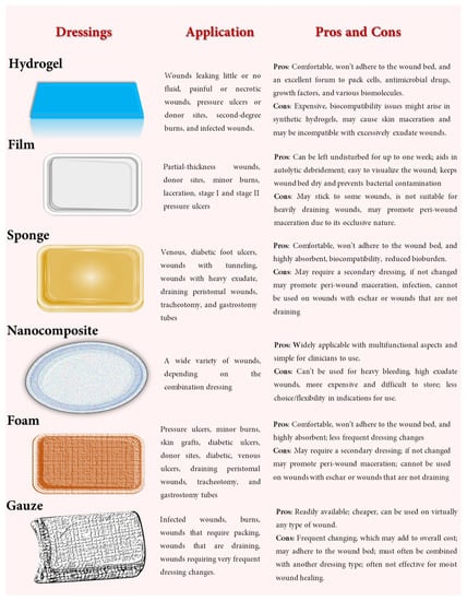 The most prevalent wound dressings come in various structures and shapes, including foams, hydrogel, topical formulations (herbal extracts, enzymatic formulations, ointments), gauze, films, nanofibers/composites, etc. (Figure 4).