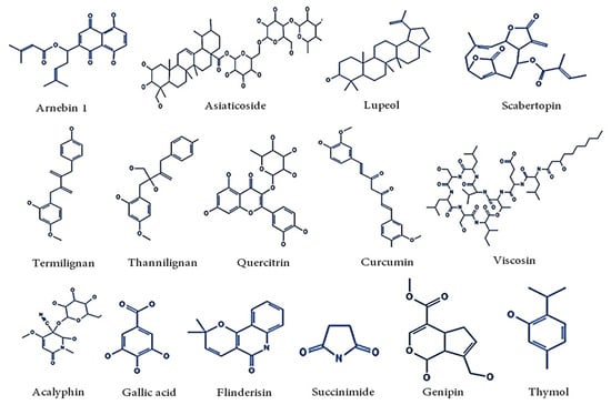 Ayurvedic preparations, biomolecules, drugs, and pharmaceutically important plants have minimal side effects, as well as less side effects than synthetic drugs, according to research on traditional and medicinal plants. Medicinal herbs and herbal preparations for tissue repair are inexpensive. Polyphenols, alkaloids, flavonoids, steroids, tannins, and terpenoids are just a few of the phytoconstituents derived from medicinal plants. Honey is one such kind of solution produced by bees using nectar from plants, and it is rich in water, monosaccharides, disaccharides, proteins, amino acids, minerals, and pigments (Figure 5). Many research studies have proven that honey is effective at all stages of the wound healing process. They have excellent anti-inflammatory and antibacterial effects [143,144]. Curcumin, demethoxycurcumin, and bisdemethoxycurcumin are three major phytoconstituents sourced from Curcuma longa. These components are proven to kill viruses and bacteria, having anti-oxidative and anti-inflammation properties [145,146]. Aloe vera is a plant that grows in hot climate regions and arid regions. This plant contains major derivatives belonging to the group of anthracenes along with sugars, enzymes, minerals, vitamins, and pigments. The remarkable healing potential of Aloe vera is due to the presence of glucomannan, which regulates fibroblast growth factors, collagen synthesis, and secretion [147,148,149]. Nimbolinin, nimbin, nimbidin, nimbidol, sodium nimbinate, gedunin, salannin, quercetin, nimbanene, 6-desacetylnimbinene, nimbandiol, nimbolide, and nimbiol are extracted from various parts of Azadirachta indica. Quercitin has a vital role as an anti-microbial agent and an anti-inflammatory agent [150,151,152].