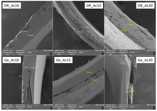Several parameters characterize the resulting polymer capsule coating: film thickness (μm) and weight of the coating (mg), converted to a percentage gain of the coating (see Table 3). For all samples, selected SEM images displayed the coating thickness (see Figure 1, Figure 2 and Figure 3). SEM images were obtained under the same conditions (3 kV; 500 μm). Only sample Ge_Ac20 was scanned at different conditions (3 kV; 1000 μm) because it was impossible to measure film thickness correctly on the higher magnification images (see Figure 2). The separation of the coating layer observed on SEM images (see Figure 1, Figure 2 and Figure 3) may have occurred due to the pressure exerted on the capsule during the incision. However, this does not seem to affect the final coating thickness measurement. The thickness of the individual coatings relates to their weight (with increasing thickness, the calculated weight of coating also increases) is shown in Table 3 and confirmed by nonparametric Spearman’s correlation (Rs = 0.69, p = 0.002). For coated DRcapsTM, capsules were determined by weight gains of coatings as follows (see Table 3), Acryl-EZE® coating values were between 9.49 ± 2.44 and 17.18 ± 1.80 (mg); for Cellacefate in the range of 6.28 ± 0.86–18.49 ± 1.91 (mg) and Eudragit® S values were from 7.99 ± 0.93 to 23.78 ± 4.47 (mg). In addition, thickness values were determined from SEM images; for Acryl-EZE® coatings from 19.40 ± 3.79 to 35.60 ± 7.97 (μm); for Cellacefate coatings in the range of 28.35 ± 3.12–70.00 ± 2.71 (μm) and Eudragit® S coatings were from 5.70 ± 0.73 to 37.75 ± 2.67 (μm), respectively. For hard gelatin capsules coated by enteric dispersions, the values of weight gain were as follows (see Table 3): Acryl-EZE® from 5.47 ± 1.76 to 15.09 ± 1.82 (mg); for Cellacefate in the range of 3.39 ± 0.68–18.44 ± 1.74 (mg); and Eudragit® S were from 4.28 ± 0.48 to 9.85 ± 1.29 (mg). Therefore, the values of coating thickness were as follows: Acryl-EZE® from 12.50 ± 3.12 to 57.90 ± 6.83 (μm); Cellacefate in the range of 8.35 ± 1.14–23.20 ± 3.74 (μm); Eudragit® S in range of 11.10 ± 2.20–19.80 ± 2.55 (μm). The different effect of polymer concentration on the increase in coating quantity in the case of Acryl-EZE® compared to Eudragit® S may be due to the presence of pigments and talc in the dispersion of Acryl-EZE®. Their presence may lead to a decrease in the adhesion of the polymer to the capsule shell, which could limit the increase in coating thickness [42,43]. According to these results, the weight of the resulting coating also increases with the increase in polymeric concentration dispersion (see Table 3).