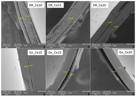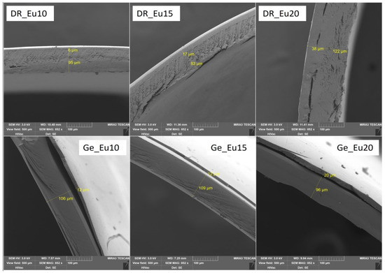 According to previous studies, the adhesion of the polymer coating is likely to depend on the capsule’s surface structure, where the gelatin capsule’s surface is smooth, and that of the HPMC capsule is rough [7,24]. However, from the obtained SEM images (see Figure 4A,B), the surface of the gelatin capsules is rougher than the HPMC/Gellan capsules. Nevertheless, the adhesion of the polymer coating remains the same as in the previous studies—better to the HPMC/Gellan capsules than to the hard gelatin capsules (see Figure 1, Figure 2 and Figure 3) regardless of the type of applied polymeric dispersion. Most visible differences are between samples DR_Ac20/Ge_Ac20; DR_Ce15/Ge_Ce15; DR_Eu10/Ge_Eu10. Results obtained in Table 3 also support these assumptions—lower weight and thickness of coating applied on hard gelatin capsule than on DRcapsTM capsule. These results indicate that the adhesion of the polymer coating to the capsule shell is not affected by its surface’s structure but by the capsule’s composition.