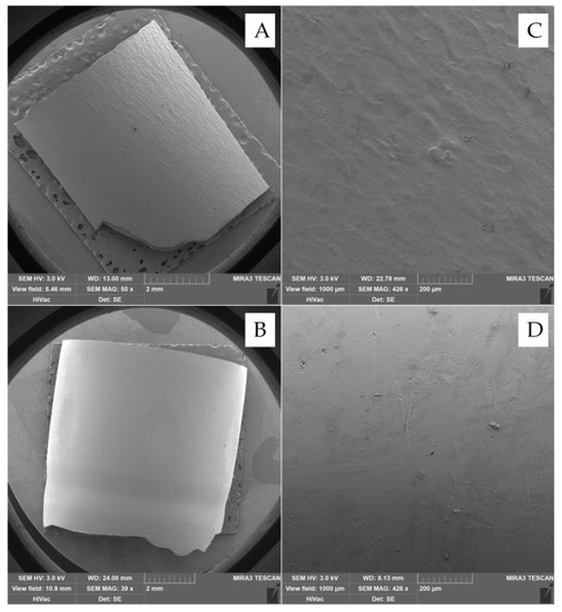 SEM images of the structure of the surface of capsules; (A) hard gelatin capsule; (B) DRcapsTM capsule; (C) hard gelatin capsule (1000 µm view field); (D) DRcapsTM capsule (1000 µm view field).