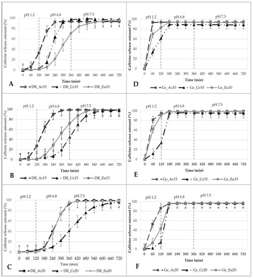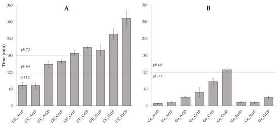 As seen in the plot (Figure 5B), the immersion method is mostly not sufficient for almost all batches of hard gelatin capsules (Ge_Ac10; Ge_Ac15; Ge_Ac20; Ge_Eu10; Ge_Eu15; Ge_Eu20; Ge_Ce10 and Ge_Ce15), since the capsules disintegrated within 120 min in an acidic environment (10 ± 1 min; 14 ± 1 min; 32 ± 2 min; 13 ± 3 min; 13 ± 4 min; 30 ± 4 min; 49 ± 16 min and 87 ± 11 min, respectively). Only sample Ge_Ce20 obtained values within pharmacopeial limits with a 129 ± 7 min disintegration time. Results of the disintegration test of DRcapsTM capsules show (see Figure 5A) that the two batches (DR_Ac10 and DR_Ac15) did not meet the pharmacopeial limits with a disintegration time of 73 ± 11 min and 73 ± 10 min. The other two samples (DR_Ac20 and DR_Ce10) disintegrated within limits (148 ± 12 min and 159 ± 6 min). On the other hand, samples (DR_Ce15; DR_Eu10; DR_Ce20; DR_Eu15 and DR_Eu20) did not disintegrate in the specified range of 120–180 min indicated for the delayed-release dosage form. Their disintegration occurred later (188 ± 9 min; 200 ± 19 min; 210 ± 4 min; 258 ± 21 min; 314 ± 29 min, respectively). This could indicate the possibility of reaching a more distant part of the digestive tract according to the transit time of the dosage form in the digestive tract [44].
